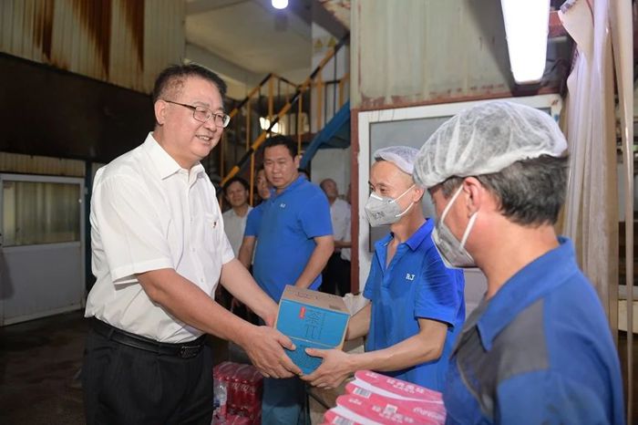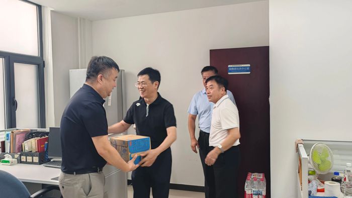 7月9日下午,WB在线党委书记、董事长陈宇,党委副书记吴瑞峰,党委常委、副总经理韩宝海,党委常委、纪委书记常延辉来到华腾橡塑,进车间、到班组,亲手将一份份清凉饮品送到一线职工手中。慰问过程中,陈宇详细了解一线职工工作生活情况,对大家冒着高温酷暑,以高度的责任感和饱满的工作热情坚守一线给予充分肯定。陈宇叮嘱大家既要高质量完成好本职工作,又要时刻关注身心健康,集团各级党组织和工会组织要从各方面确保防暑降温工作落到实处,保证干部职工健康安全。
