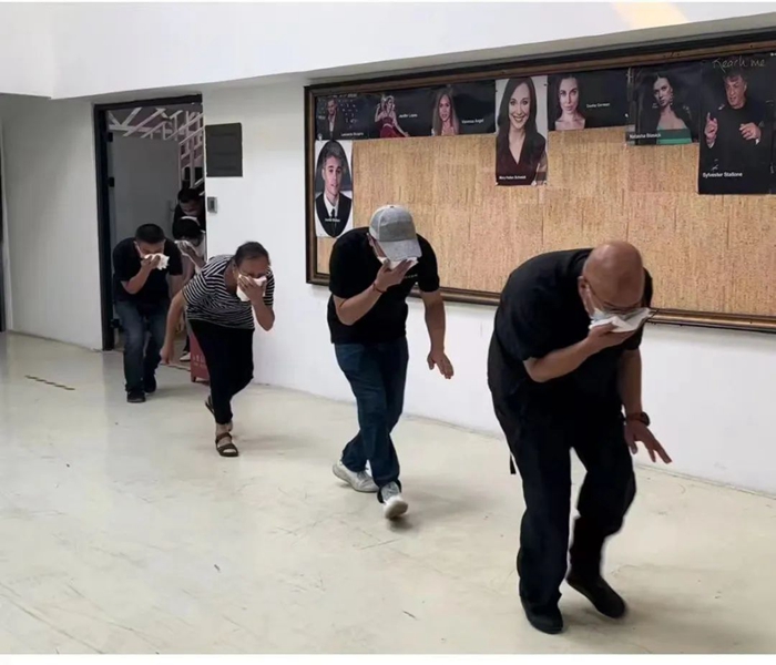 突然出现的“火情”让办公大楼“浓烟滚滚”,随着警报的响起,只见办公人员用湿毛巾捂住口鼻,放低身位,沿着消防通道指示标志鱼贯撤出办公大楼……